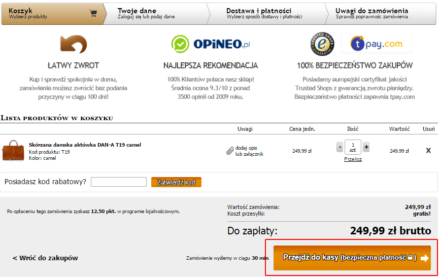 b) Jeżeli chcesz kontynuować składanie zamówienia kliknij "Przejdź do kasy (bezpieczna płatność)"