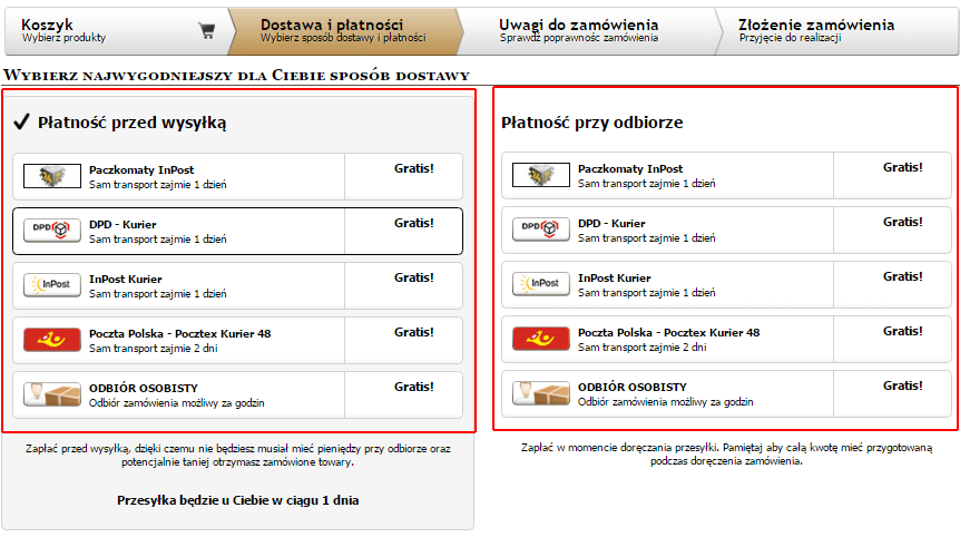 Wybierz metodę płatności (płatność przed wysyłką lub płatność przy odbiorze) i kliknij w wybranej kolumnie na konkretną formę dostawy